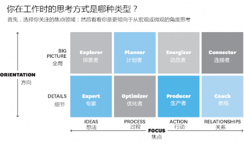 了解自己的思考風(fēng)格,并將其告訴別人,同時也鼓勵別人把他們自己的風(fēng)格告訴你,這樣會對工作有所幫助。此時對于團隊來說,你的思維方式就變成了一個有用的工具,一種社交貨幣。想象自己在為一個新目標(biāo)組建團隊時,你難道不想清楚地明白誰會為全局策略的討論興奮,誰又會產(chǎn)生挫敗感嗎? 誰喜歡執(zhí)行具體的工作,誰又有樂于管理團隊呢?