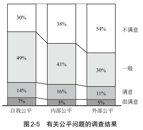 通過以上 3個(gè)問題的調(diào)查結(jié)果可以看出,在自我公平方面,不滿意員工比例為 30%;在內(nèi)部公平方面,不滿意員工比例為 38%;在外部公平方面,不滿意員工比例為 54%。