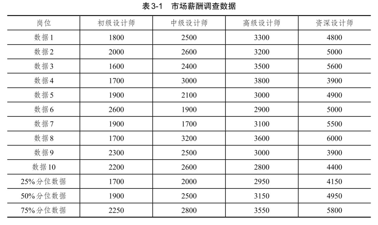 按上述方法將數(shù)據(jù)進(jìn)行修正后,每個(gè)典型崗位薪酬對(duì)應(yīng)著一系列數(shù)據(jù),將這些數(shù)據(jù)從高到低排序,找出典型崗位對(duì)應(yīng)的 25%分位、 50%分位、 75%分位的薪酬數(shù)據(jù),如表 3-1所示。