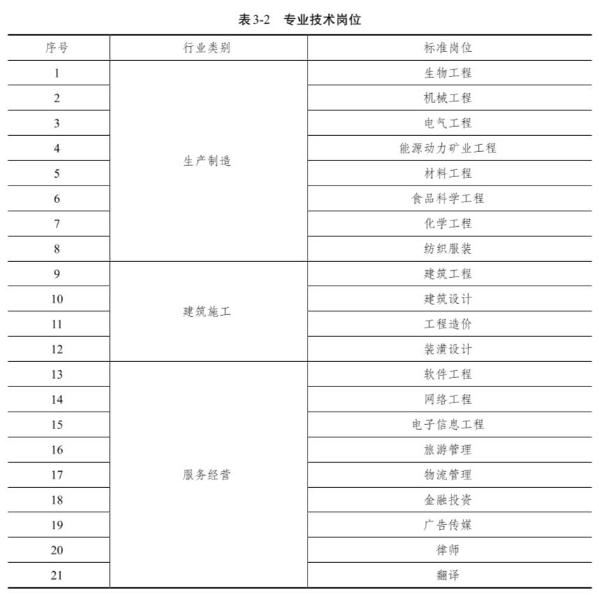 水木知行關(guān)注專業(yè)技術(shù)、職能管理兩個(gè)領(lǐng)域 28個(gè)核心崗位薪酬數(shù)據(jù),樣本選擇大學(xué)本科相同或相近專業(yè)畢業(yè)后一直從事該領(lǐng)域工作的任職者薪酬水平。該薪酬本身就是具有競(jìng)爭(zhēng)力的薪酬水平,因此水木知行專業(yè)技術(shù)及管理崗位薪酬數(shù)據(jù)被稱為競(jìng)爭(zhēng)性薪酬數(shù)據(jù)。這 28個(gè)崗位中,專業(yè)技術(shù)崗位 21個(gè),職能管理崗位 7個(gè)。在 21個(gè)專業(yè)技術(shù)崗位中,生產(chǎn)制造領(lǐng)域 8個(gè),建筑施工領(lǐng)域 4個(gè),服務(wù)經(jīng)營領(lǐng)域 9個(gè)。見表 3-2和表 3-3。