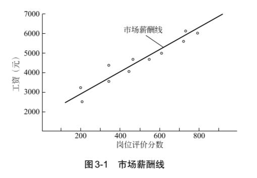 將典型崗位評(píng)價(jià)分?jǐn)?shù)做變量,典型崗位薪酬數(shù)額做因變量,經(jīng)線性回歸可以得到一條直線,這條直線稱為市場(chǎng)薪酬線。市場(chǎng)薪酬線對(duì)薪酬水平設(shè)計(jì)具有重要的指導(dǎo)意義。由于每個(gè)典型崗位都有很多薪酬數(shù)據(jù),一般取平均值或中位值作為這個(gè)典型崗位的薪酬數(shù)額,如圖3-1。