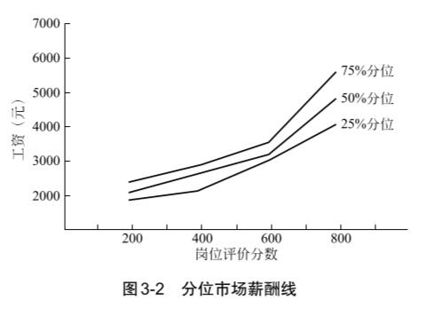除上述市場(chǎng)薪酬線外,還可以繪制 25%分位、 50%分位、 75%分位市場(chǎng)薪酬線,這些市場(chǎng)薪酬線對(duì)薪酬水平設(shè)計(jì)更加具有指導(dǎo)意義。圖 3-2就是圖3-1對(duì)應(yīng)數(shù)據(jù)的 25%分位、50%分位、75%分位市場(chǎng)薪酬線。