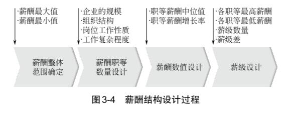 薪酬結構設計包括制定薪酬政策線、確定職等數量和薪酬中值、確定薪酬浮動幅度等幾個方面。這幾個因素確定后,職等薪酬增長率、薪酬變動比率、薪級數目以及薪級級差就都確定下來了。