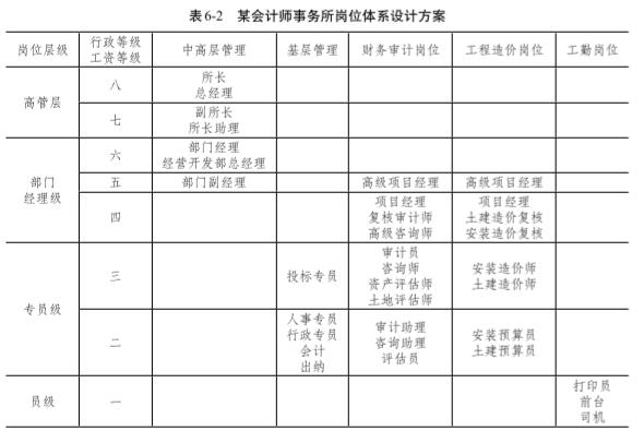 表 6-2是某會計師事務所崗位體系設計方案,包括崗位序列、崗位層級等。需要指出的是,表中崗位層級是公司的實質決策層級,一至八是公司的行政等級,是職位晉升體系,對應著薪酬體系的工資等級。