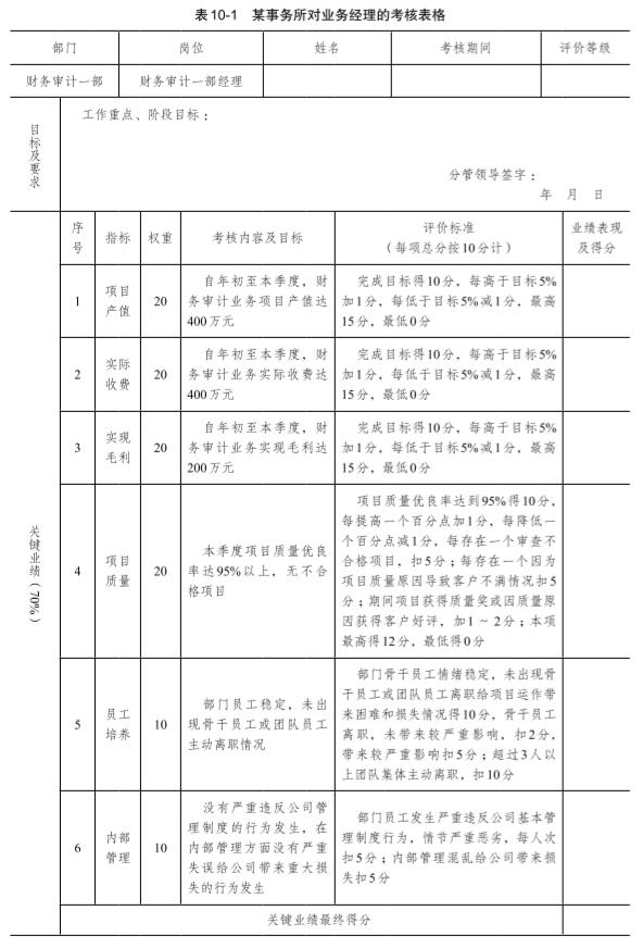 團(tuán)隊(duì)負(fù)責(zé)人同樣要進(jìn)行階段考核,階段考核除了關(guān)鍵業(yè)績考核外,一般還引入能力素質(zhì)考核,關(guān)鍵業(yè)績考核與部門關(guān)鍵業(yè)績考核等同對(duì)待。很多公司對(duì)部門負(fù)責(zé)人考核引入末位淘汰思想,績效考核分?jǐn)?shù)低于一定分?jǐn)?shù)并且位列后幾位者為“待改進(jìn)”等級(jí)或“不合格”等級(jí)。表10-1為某事務(wù)所業(yè)務(wù)經(jīng)理的考核資料。