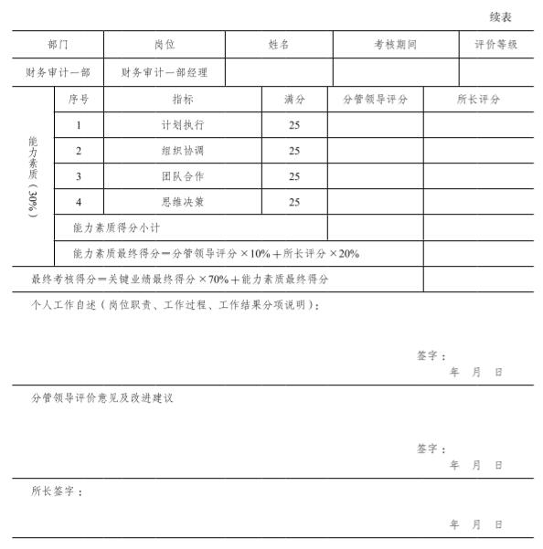 (4)部門經(jīng)理、副經(jīng)理進(jìn)行季度考核,考核內(nèi)容為關(guān)鍵業(yè)績指標(biāo)、能力素質(zhì)指標(biāo)及部門滿意度、項(xiàng)目滿意度,部門經(jīng)理(副經(jīng)理)考核最終得分=部門關(guān)鍵業(yè)績季