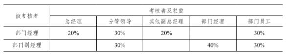 (6)部門經(jīng)理、副經(jīng)理能力素質(zhì)考核指標(biāo)由分管領(lǐng)導(dǎo)從能力素質(zhì)模型詞典中選擇,總經(jīng)理審定,能力素質(zhì)考核按季度進(jìn)行。各考核者所占權(quán)重見下表。