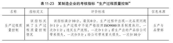 表11-23為制造企業(yè)生產(chǎn)與品管部的考核指標“生產(chǎn)過程質(zhì)量控制”。產(chǎn)品質(zhì)量歷來是企業(yè)管理的關(guān)鍵問題之一,直接影響到客戶滿意度和企業(yè)品牌。該公司產(chǎn)品出口歐美,對產(chǎn)品質(zhì)量要求較高,對生產(chǎn)與品管部增加“生產(chǎn)過程質(zhì)量控制”的考核,可以強化各生產(chǎn)部門及其員工的過程管理意識和質(zhì)量意識。