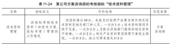 表11-24為某公司對方案咨詢部“技術(shù)資料管理”的考核指標。該部門是外部客戶需求與內(nèi)部生產(chǎn)管理的重要接口部門,但在實際操作中,經(jīng)常出現(xiàn)信息傳遞缺失、不及時、不準確甚至資料遺失等問題,主要原因在于該部門一直沒有重視技術(shù)資料的管理。因此,公司將該項工作內(nèi)容作為考核指標,增強技術(shù)資料管理力度,實現(xiàn)了信息的準確、及時、有效傳遞。
