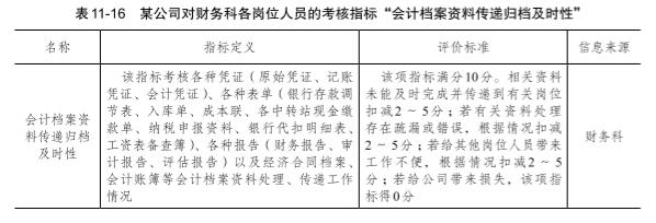 表 11-16為某公司對財務科各崗位人員的考核指標“會計檔案資料傳遞歸檔及時性”,指標定義非常明確,評價標準也非常清晰。