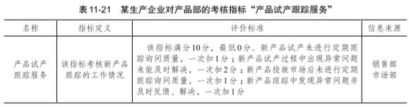 表 11-21為某生產(chǎn)企業(yè)對產(chǎn)品部的考核指標“產(chǎn)品試產(chǎn)跟蹤服務”。新產(chǎn)品的試產(chǎn)跟蹤情況不但關(guān)系到客戶關(guān)系維護,更關(guān)系到新產(chǎn)品改進提升,對公司長期競爭力有重要影響。因此,該公司在新產(chǎn)品試產(chǎn)及跟蹤服務方面下了非常大的功夫,不但對扣分情況作了規(guī)定,還設(shè)置了獎勵分數(shù),鼓勵在新產(chǎn)品跟蹤中發(fā)現(xiàn)異常問題的行為,使得評價標準非常清晰,可操作性強。