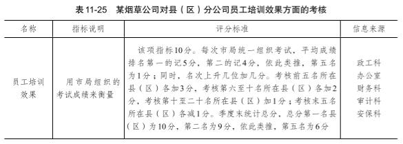 綜合評分法是通過設(shè)計一定的規(guī)則來進行評分而不是簡單地加減分數(shù)。表 11-25為某煙草公司對縣(區(qū))分公司員工培訓效果方面的考核。評分辦法實質(zhì)是通過一定的計分規(guī)則算出總分,排序后根據(jù)排序名次確定最終分數(shù)。