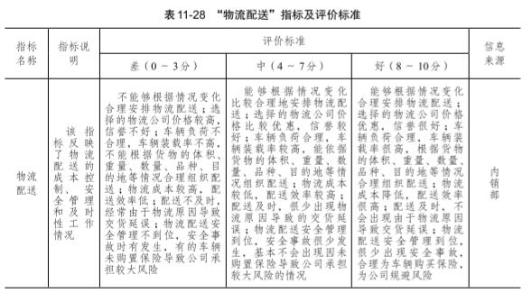 表11-28為某公司內(nèi)銷部的“物流配送”指標及其評價標準。通過制定這一標準,不僅能提高考核評價的公平性和有效性;更重要的是,它有利于實現(xiàn)部門及其員工在配送安排、車量負荷、物流成本、及時性以及安全性等方面的過程管理和控制。被考核者通過評價標準,可以清楚地知道目標工作的水平和自己存在的差距,有針對性地采取措施,提升績效水平。
