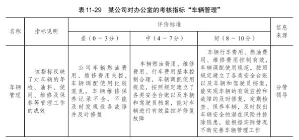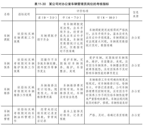 將表 11-29中的考核指標“車輛管理”進行分解,可以得到“車輛調(diào)配、車輛維修、車輛保養(yǎng)、車輛油料管理”四個考核指標,作為對車輛管理員崗位的考核。表 11-30為這四個指標的評價標準。
