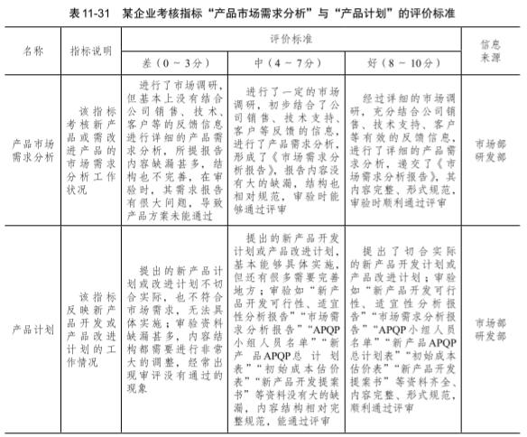 表11-31為某企業(yè)對為規(guī)范產(chǎn)品設計流程而設立的“產(chǎn)品市場需求分析”和“產(chǎn)品計劃”的考核指標,以減少產(chǎn)品開發(fā)和設計中的隨意性,增強產(chǎn)品開發(fā)和決策的科學性。