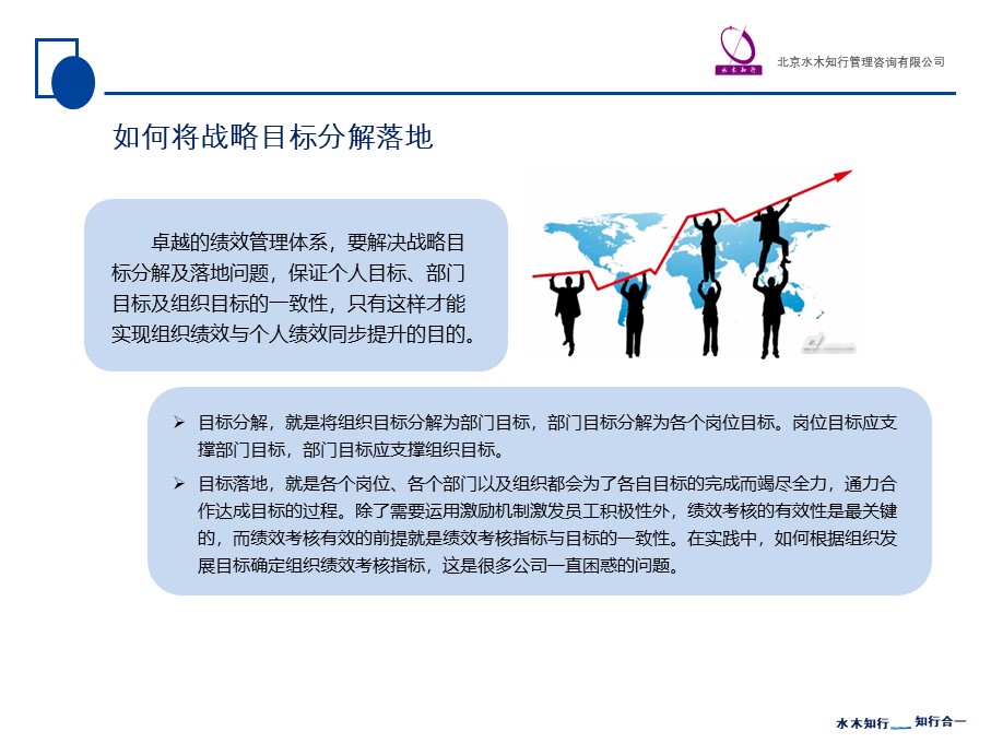 卓越的績效管理體系,要解決戰(zhàn)略目標分解及落地問題,保證個人目標、部門目標及組織目標的一致性,只有這樣才能實現(xiàn)組織績效與個人績效同步提升的目的。