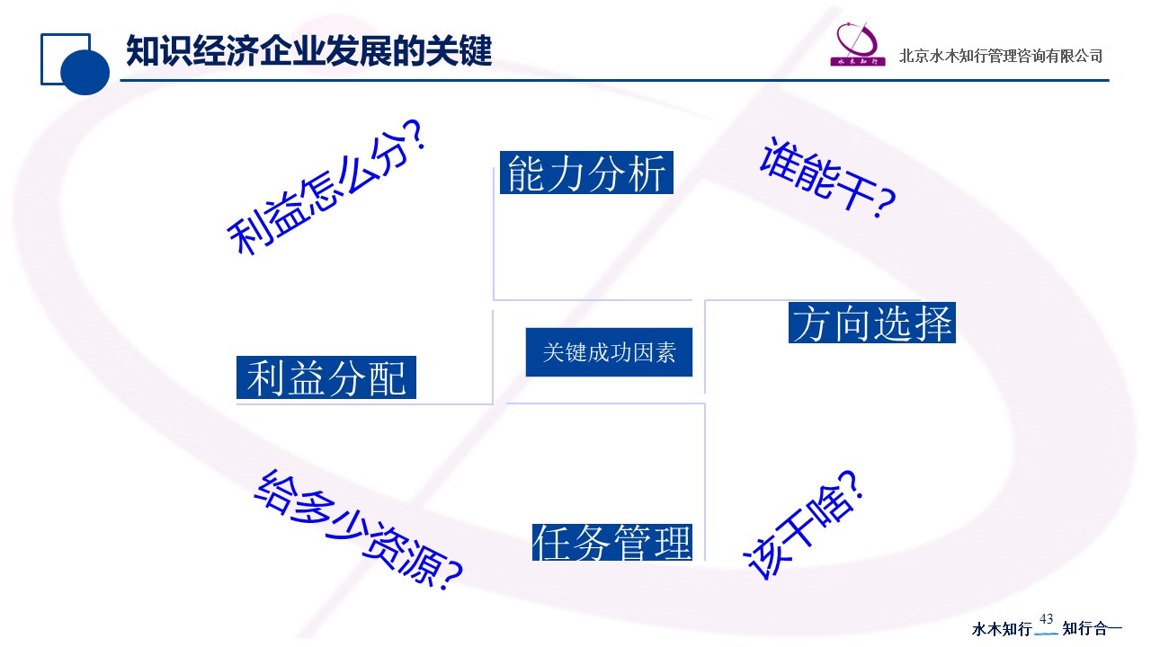 解決知識經(jīng)濟的“三人五人問題”,同樣需要老板與員工在“誰能干”、“該干啥”、“給多少資源”、“利益怎么分”四個方面達成共識。一個人能力不行,一件事情做不好,其他類似事情再次給予機會也很難做好,因此員工具備一定的“能力”是基礎;外部環(huán)境變化加快,很多事情對公司而言一方面是挑戰(zhàn),另一方面也意味著機會,及時識別和把握機會非常關鍵;公司決定做一個事情或項目后,可能會成功,也存在不成功的可能性,卓越企業(yè)與平庸企業(yè)差別在于卓越的企業(yè)知道及時止損和資源控制非常重要;當事情或項目小有成就,初步成功后,如果利益分配出現(xiàn)問題,創(chuàng)始團隊極容易出現(xiàn)穩(wěn)定問題,影響企業(yè)進一步發(fā)展,因此應該事先設計好均衡的利益分配機制。