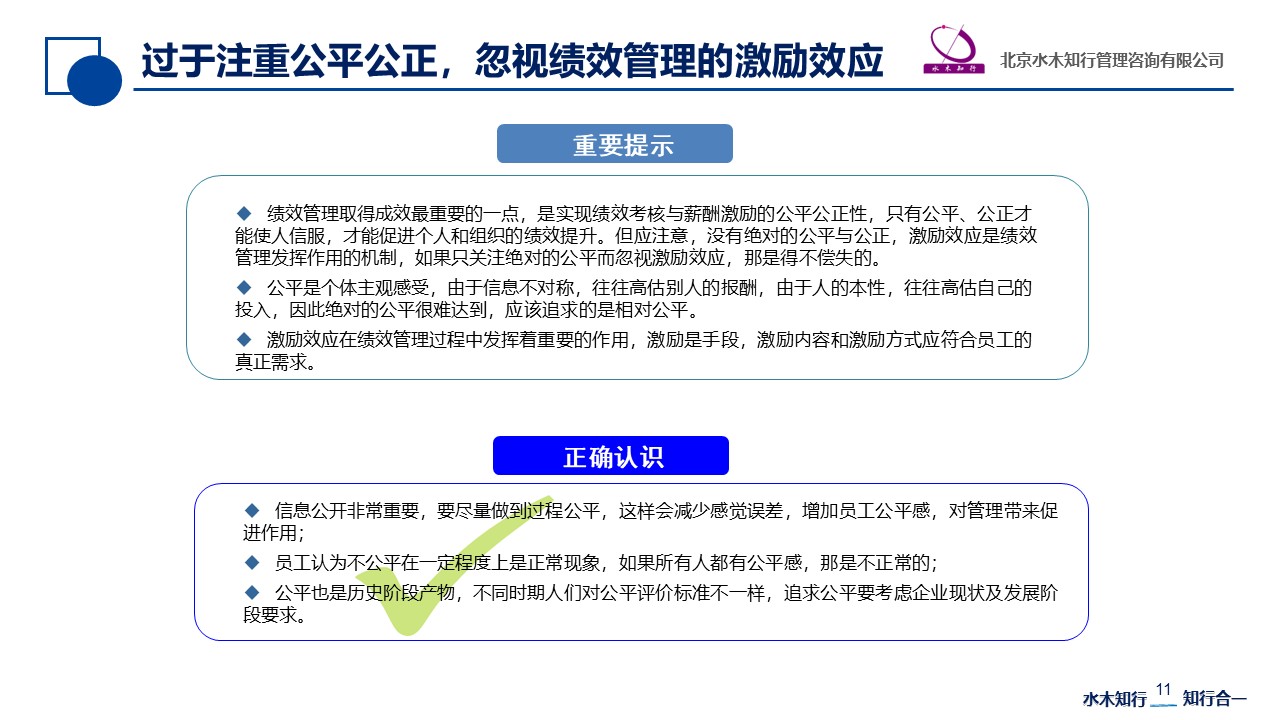 績效管理取得成效,最重要的一點是實現(xiàn)績效考核與薪酬激勵的公平公正性。只有公平、公正才能使人信服,才能促進個人和組織的績效提升。但應(yīng)注意,沒有絕對的公平與公正,激勵效應(yīng)是績效管理發(fā)揮作用的前提,如果只關(guān)注公平而忽視激勵效應(yīng),那是得不償失的。