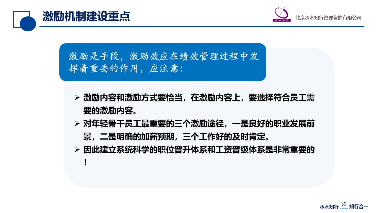 激勵手段、獎勵效應(yīng)在績效管理中發(fā)揮著重要作用,有以下幾點需要注意。第一,激勵內(nèi)容和激勵方式要恰當(dāng),激勵內(nèi)容應(yīng)是員工需要的,對年輕骨干員工最重要的激勵是有良好的職業(yè)發(fā)展前景,明確的加薪預(yù)期,工作好的及時肯定??茖W(xué)系統(tǒng)的職位發(fā)展體系和工資晉級體系是非常重要的。第二,激勵機制不僅僅體現(xiàn)在薪酬安排上,在很多方面都應(yīng)有激勵機制,在評價標(biāo)準(zhǔn)的設(shè)計上也應(yīng)是有激勵的。
