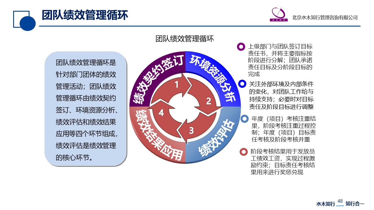 團(tuán)隊(duì)績(jī)效管理循環(huán)由績(jī)效契約簽訂、環(huán)境資源分析、績(jī)效評(píng)估和績(jī)效結(jié)果應(yīng)用四個(gè)環(huán)節(jié)組成???jī)效評(píng)估是績(jī)效管理的核心環(huán)節(jié),公司目標(biāo)管理、預(yù)算核算等基礎(chǔ)管理水平對(duì)團(tuán)隊(duì)的績(jī)效管理有非常重要的影響。