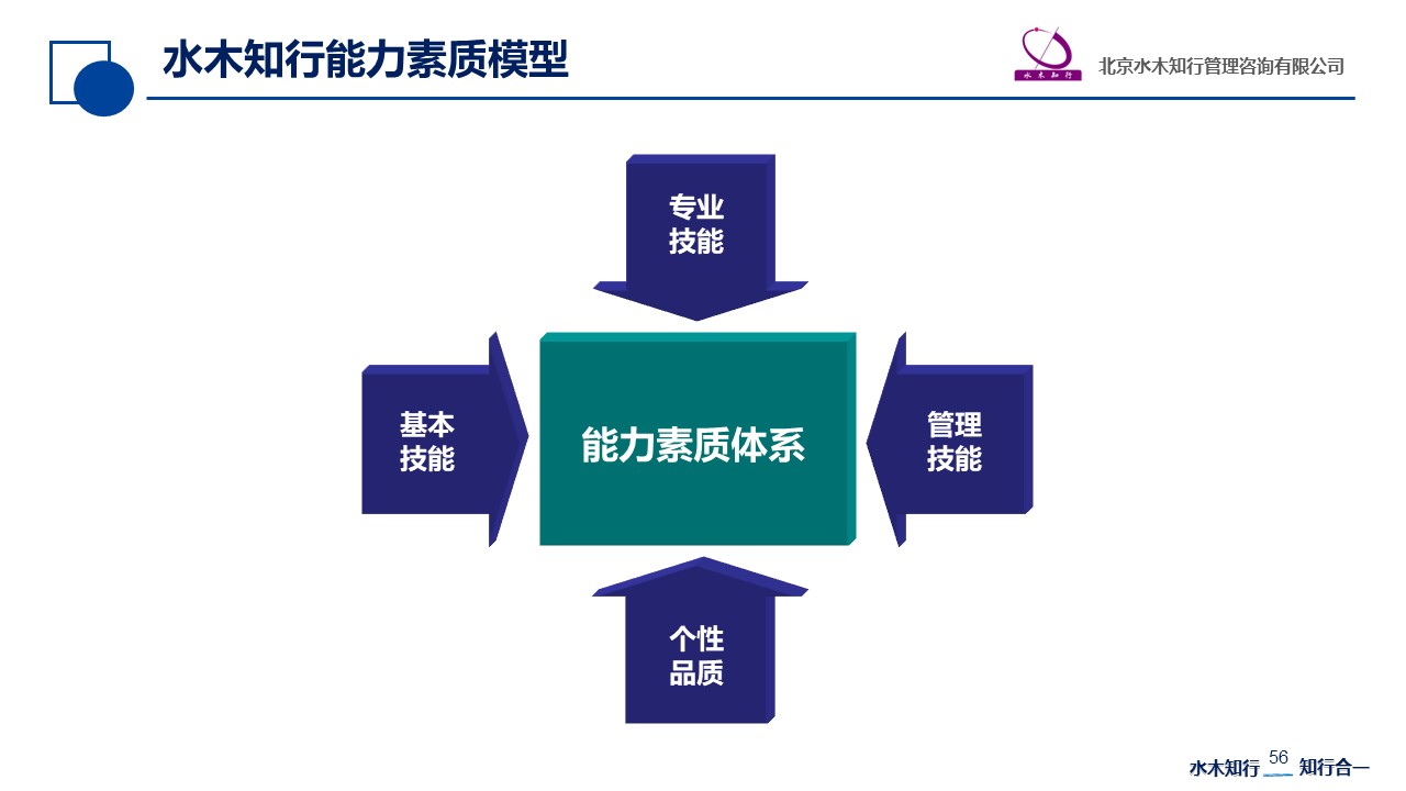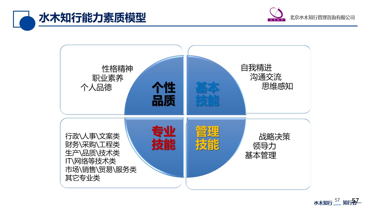 水木知行能力素質(zhì)模型包括四個(gè)范疇:個(gè)性品質(zhì)、基本技能、管理技能和專業(yè)技能。