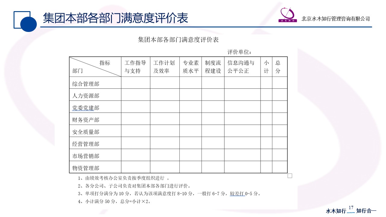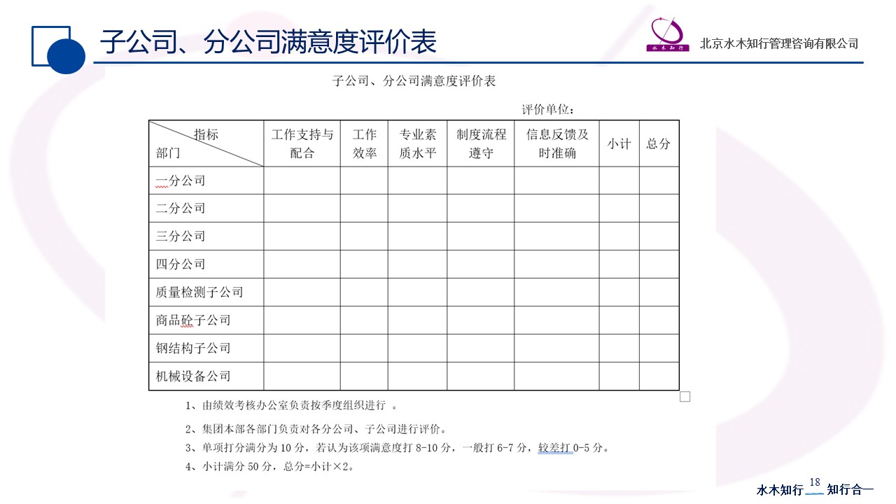除了工程公司項目部根據(jù)要項目周期進行項目考核外,其他部門團隊?wèi)?yīng)該進行年度考核,年度考核(項目考核)注重結(jié)果。公司將發(fā)展戰(zhàn)略及年度經(jīng)營目標(biāo)向各個部門(項目)分解后,應(yīng)組織與各個部門(項目)簽訂經(jīng)營目標(biāo)責(zé)任書,年度考核(項目考核)于次年初(項目結(jié)束后)根據(jù)經(jīng)營目標(biāo)完成情況進行。如果公司規(guī)模比較小,職能部門沒有有效的定量考核指標(biāo),職能部門年度考核結(jié)果一般根據(jù)階段考核結(jié)果確定,不再進行年度考核。在需要多個部門協(xié)調(diào)配合的企業(yè)中,往往還會對各部門團隊進行部門(項目)滿意度考核,同級部門之間、上級對下級部門、下級對上級部門都可以進行滿意度考核評價。
