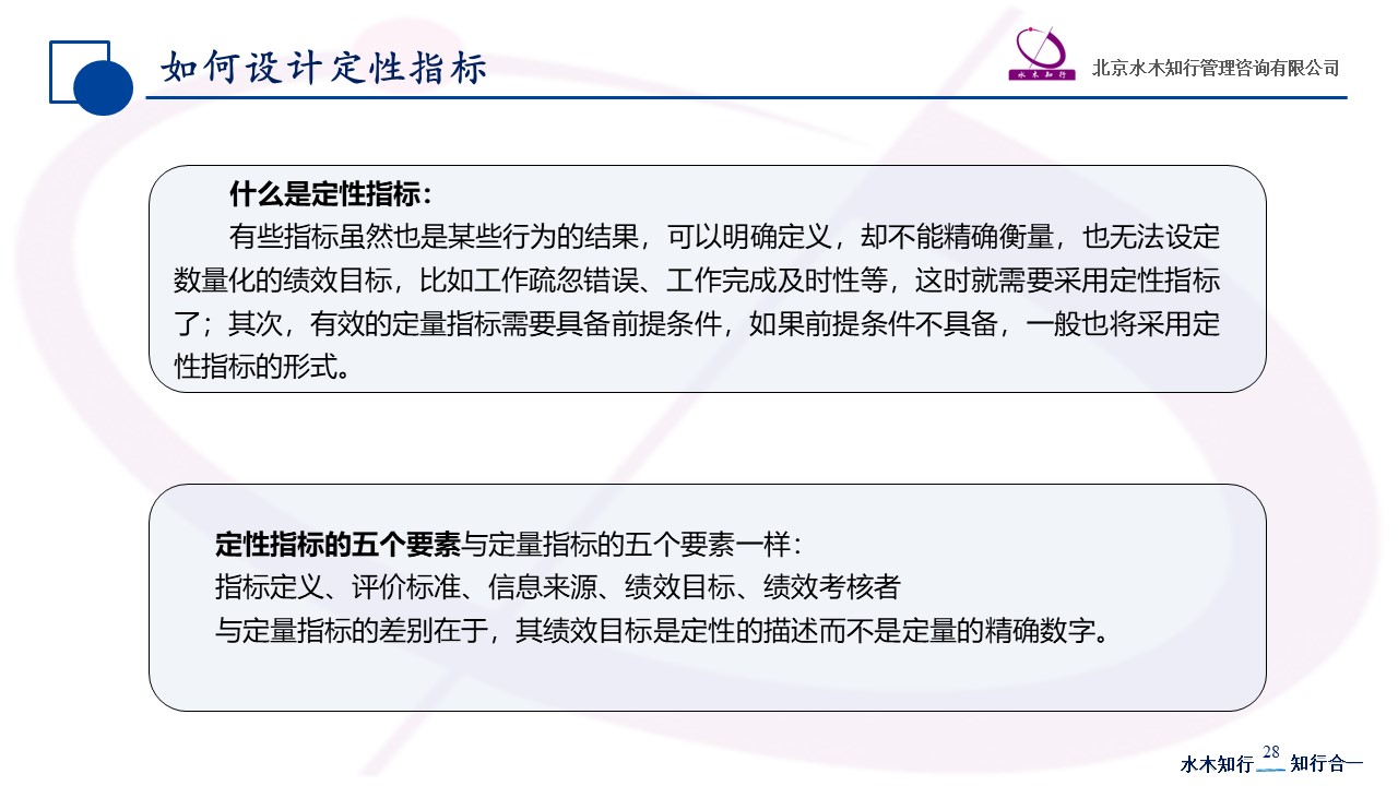 第一,對(duì)于反映工作中關(guān)鍵行為的考核,可以通過(guò)分析高績(jī)效行為特征,用定性描述的方式確定績(jī)效目標(biāo)和評(píng)價(jià)標(biāo)準(zhǔn);第二,有些指標(biāo)雖然也是某些行為的結(jié)果,可以明確定義,卻不能精確衡量,也無(wú)法設(shè)定數(shù)量化的績(jī)效目標(biāo),比如工作疏忽錯(cuò)誤、工作完成及時(shí)性等,這時(shí)也需要采用定性指標(biāo);第三,有效的定量指標(biāo)需要具備前提條件,如果前提條件不具備,一般也采用定性指標(biāo)的形式。
