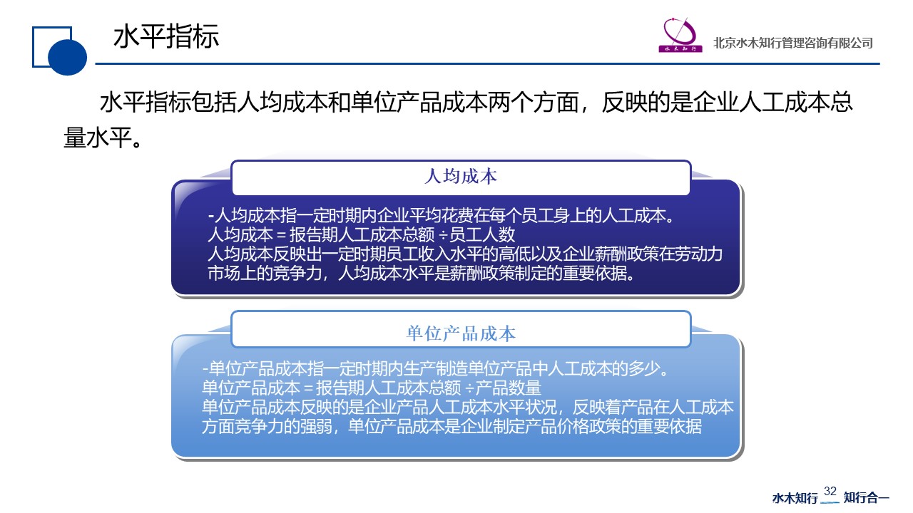 水平指標包括人均成本和單位產(chǎn)品成本兩個方面,反映的是企業(yè)人工成本總量水平。