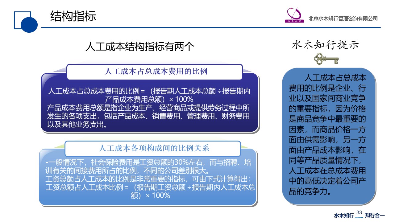 人工成本結構指標有兩個:一是人工成本占產(chǎn)品總成本的比例;二是人工成本中各項構成比例關系,主要指工資成本占人工成本的比例。