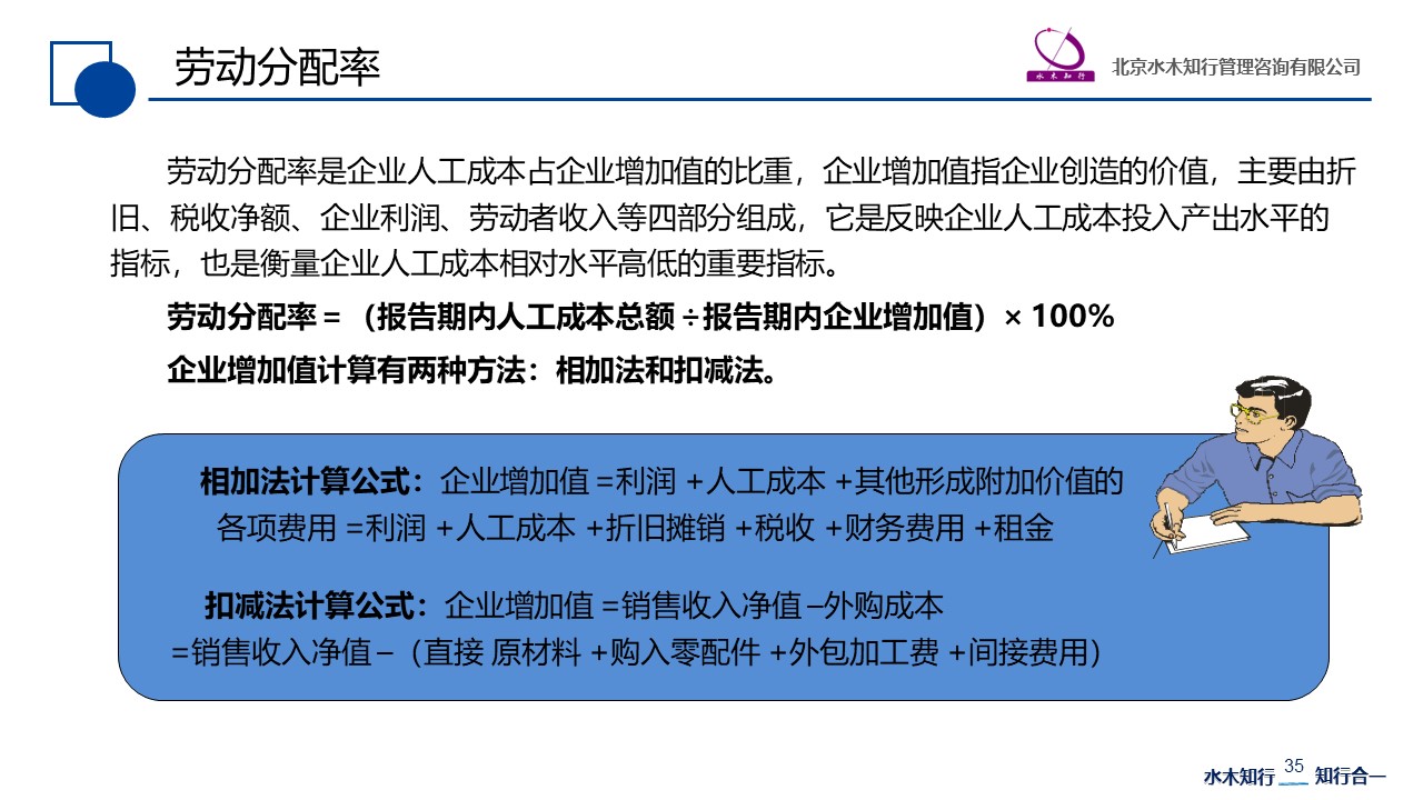 勞動分配率是企業(yè)人工成本占企業(yè)增加值的比重,企業(yè)增加值指企業(yè)創(chuàng)造的價值,主要由折舊、稅收凈額、企業(yè)利潤、勞動者收入等四部分組成,它是反映企業(yè)人工成本投入產(chǎn)出水平的指標,也是衡量企業(yè)人工成本相對水平高低的重要指標。