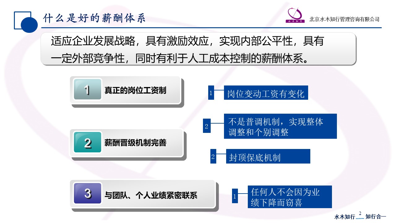 水木知行3PM薪酬體系以崗位價值為基礎(chǔ),充分考慮個人能力因素,強(qiáng)調(diào)收入與團(tuán)隊(duì)及個人業(yè)績緊密聯(lián)系,同時能根據(jù)人力資源市場價格水平及時動態(tài)調(diào)整,因此得到了廣泛應(yīng)用,不僅適用于知識密集型、資本密集型企業(yè),對勞動密集型企業(yè)也完全適用。