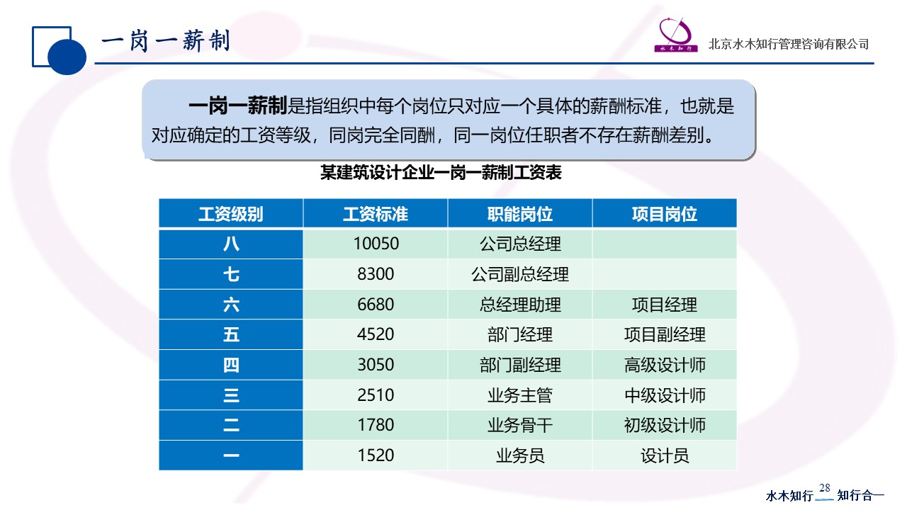 一崗一薪制是指組織中每個(gè)崗位只對(duì)應(yīng)一個(gè)具體的薪酬標(biāo)準(zhǔn),也就是對(duì)應(yīng)確定的工資等級(jí),同崗?fù)耆?,同一崗位任職者不存在薪酬差別。