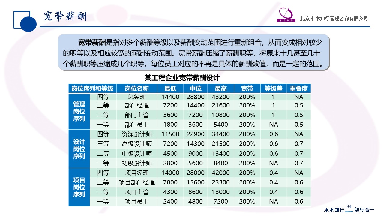 寬帶薪酬是指對(duì)多個(gè)薪酬等級(jí)以及薪酬變動(dòng)范圍進(jìn)行重新組合,從而變成相對(duì)較少的職等以及相應(yīng)較寬的薪酬變動(dòng)范圍。寬帶薪酬壓縮了薪酬職等,將原來(lái)十幾甚至幾十個(gè)薪酬職等壓縮成幾個(gè)職等,每位員工對(duì)應(yīng)的不再是具體的薪酬數(shù)值,而是一定的范圍。