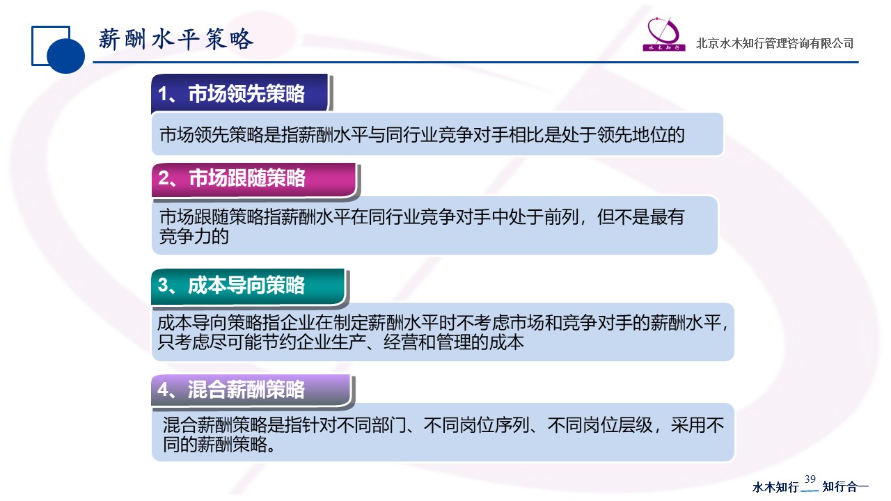 企業(yè)可采取的薪酬水平策略主要有:市場領(lǐng)先策略、市場跟隨策略、成本導(dǎo)向策略和混合薪酬策略。