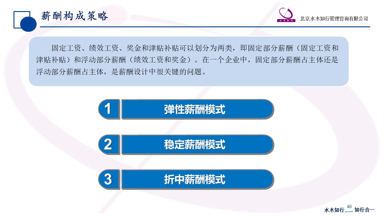 固定工資、績效工資、獎金和津貼補(bǔ)貼可以劃分為兩類,即固定部分薪酬(固定工資和津貼補(bǔ)貼)和浮動部分薪酬(績效工資和獎金)。在一個企業(yè)中,固定部分薪酬占主體還是浮動部分薪酬占主體,是薪酬設(shè)計中很關(guān)鍵的問題。企業(yè)經(jīng)常采用的薪酬構(gòu)成策略有:彈性薪酬模式、穩(wěn)定薪酬模式和折中薪酬模式。