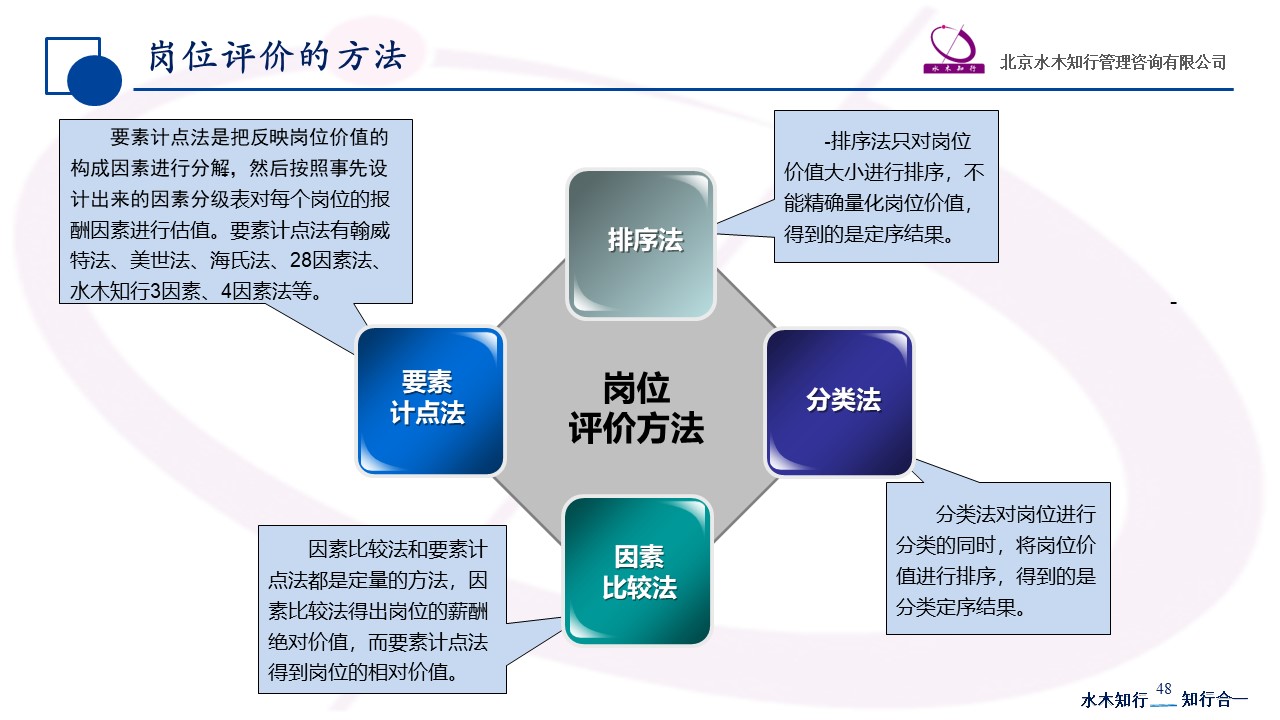 崗位評價(jià)方法主要有排序法、分類法、因素比較法和要素計(jì)點(diǎn)法四大類。