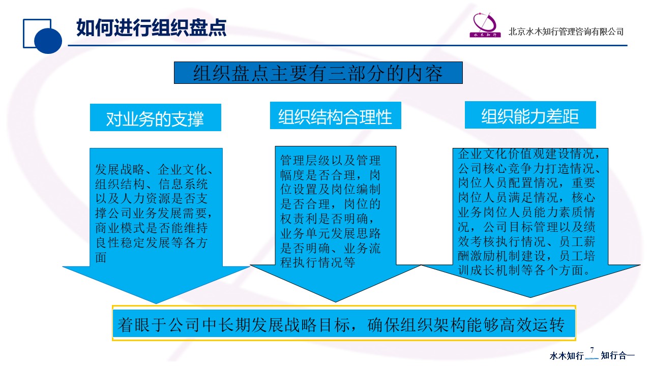 組織盤點(diǎn)是對(duì)公司的發(fā)展戰(zhàn)略、企業(yè)文化、組織結(jié)構(gòu)及商業(yè)模式、崗位體系及人員配置、員工薪酬激勵(lì)等核心制度是否合理、是否互相支撐,公司組織環(huán)境是否有利于員工的成長(zhǎng)和發(fā)展等方面進(jìn)行分析和判斷,提出組織中存在的問題并給與解決方案的日常性管理工作,可以定期(年度)組織進(jìn)行。做好組織盤點(diǎn),及時(shí)發(fā)展企業(yè)管理中存在的問題,建設(shè)有利于員工成長(zhǎng)和發(fā)展的組織環(huán)境非常重要,是企業(yè)長(zhǎng)期良性發(fā)展的關(guān)鍵。做好組織盤點(diǎn)工作,也是做好人才盤點(diǎn)工作的先決條件,組織環(huán)境影響著員工的成長(zhǎng)和發(fā)展,影響著員工潛能的發(fā)揮,影響著對(duì)不同人員的人才策略選擇。