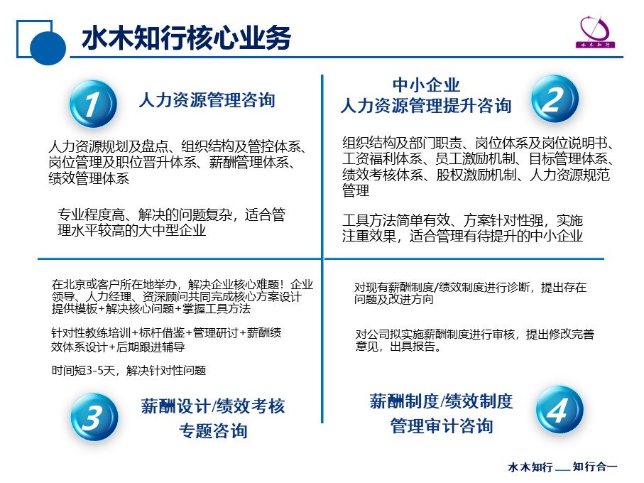 北京水木知行管理咨詢公司(www.m.apevm.com)專注提供人力資源管理咨詢以及人力資源管理實戰(zhàn)培訓(xùn)業(yè)務(wù) - 上一篇:人力資源管理專業(yè)咨詢 下一篇:企業(yè)管理實戰(zhàn)培訓(xùn)