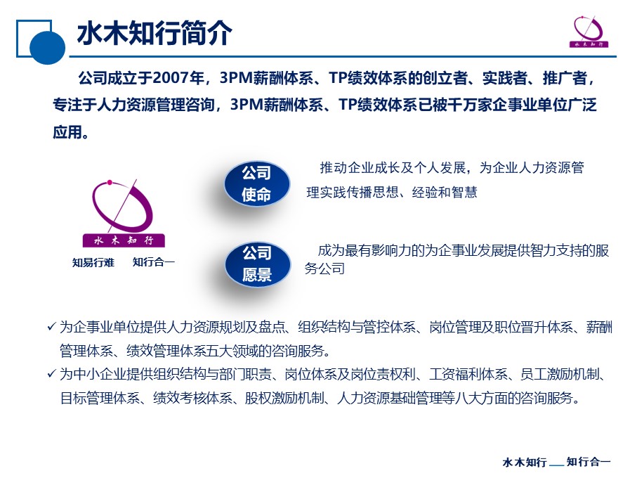推動企業(yè)成長與發(fā)展,為企業(yè)薪酬績效管理實踐傳播思想、經(jīng)驗和智慧是水木知行的使命;成為最有影響力的為企業(yè)薪酬績效管理實踐提供智力支持的服務公司是水木知行的愿景。
