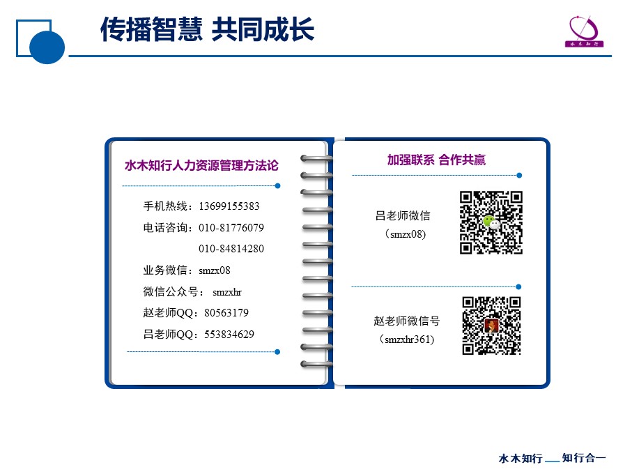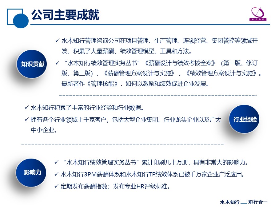 水木知行在人力資源領域的貢獻:發(fā)布hr專業(yè)等級評定標準并得到廣泛認可,定期發(fā)布專業(yè)技術崗位薪酬指數(shù);水木知行提出薪酬績效管理理念和工具要與東方人性格特征以及企業(yè)管理基礎相結合,薪酬績效管理方式方法要與公司發(fā)展戰(zhàn)略、企業(yè)文化及管理風格相匹配;水木知行3PM薪酬體系和TP績效體系已被千萬家企事業(yè)單位廣泛應用,水木知行薪酬管理模型、績效管理模型、綜合激勵模型、員工滿意度模型、能力素質(zhì)模型、hr能力等級評定模型、薪酬指數(shù)模型等工具方法已被相關論文及書籍廣泛引用。