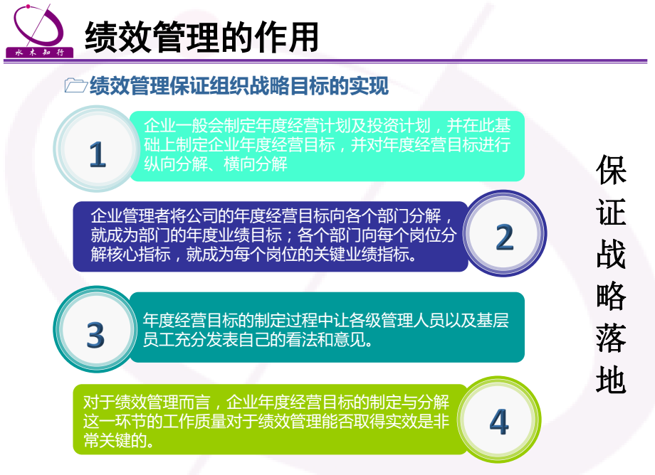 實(shí)現(xiàn)績(jī)效管理的戰(zhàn)略導(dǎo)向,保證個(gè)人目標(biāo)、部門(mén)目標(biāo)與組織目標(biāo)一致是績(jī)效管理的重要方面???jī)效管理不能實(shí)現(xiàn)戰(zhàn)略導(dǎo)向主要有兩種情況,第一種情況是績(jī)效考核指標(biāo)選擇太多或互相矛盾,體現(xiàn)不出績(jī)效考核導(dǎo)向;第二種情況就是績(jī)效考核導(dǎo)向錯(cuò)誤或者績(jī)效考核指標(biāo)設(shè)計(jì)有問(wèn)題,員工和部門(mén)的行為并沒(méi)有按著組織期望的行為去發(fā)展。